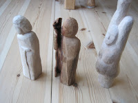 I løbet af sommeren har jeg været med Kæresten og nogle venner på en række shelterture, hvor vi sidder rundt om bålet den halve nat, og nogle gange overnatter vi også i skoven. Hver gang går jeg så i gang med at snitte en træfigur, som jeg så færdiggøre derhjemme. Denne forestiller godt nok en hare, men alle de andre har været små mennesker, for jeg fik oprindeligt ideen fra Emil fra Lønneberg.